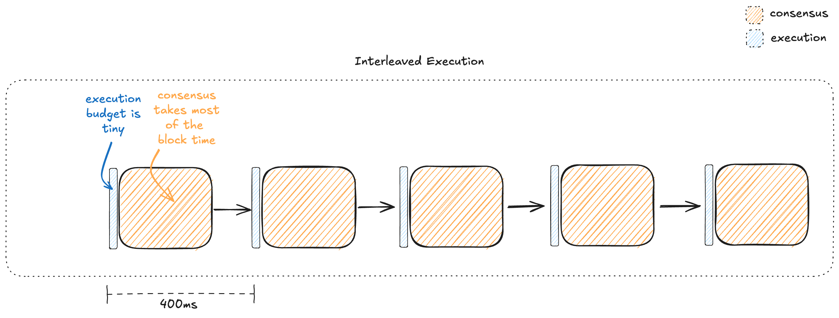 We refer to this style of blockchain as one that has execution interleaved with consensus. In this paradigm, the time budget for execution is extremely limited, since it has to happen twice and leave enough time for multiple rounds of cross-globe communication for consensus.